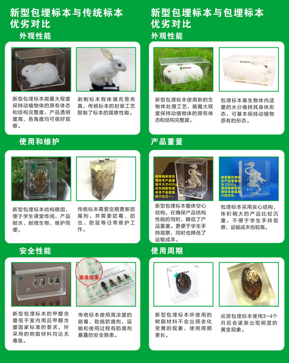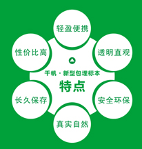 新型包埋標本的特點 ◆輕盈便攜、透明直觀:產(chǎn)品為空心結構,輕便易觀察。 ◆安全環(huán)保、自然真實:使用包埋材料和封裝材料環(huán)保安全。先進的動植物干燥處理工藝,不破壞動植物的原有的整體結構,更完整,更逼真。 ◆長久保存、性價比高:高分子材料滲透包裹處理,更經(jīng)久耐用。空心結構降低產(chǎn)品的重量,性價比更高。 |